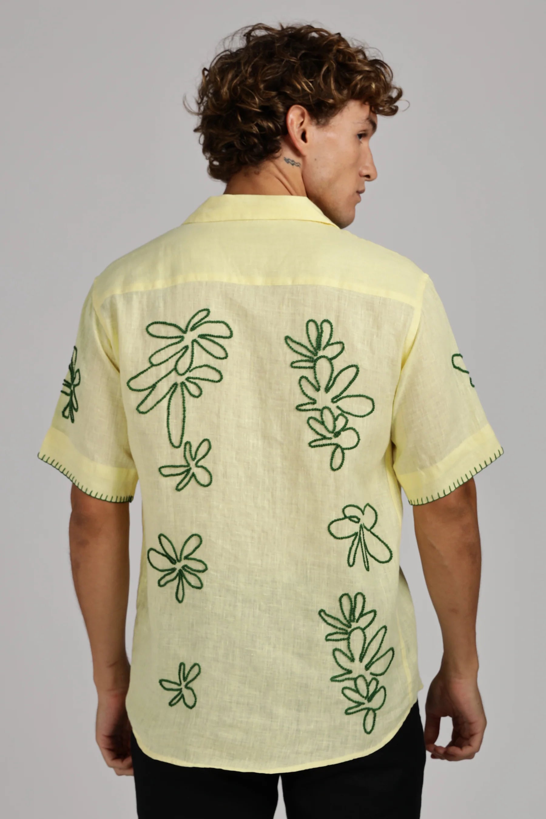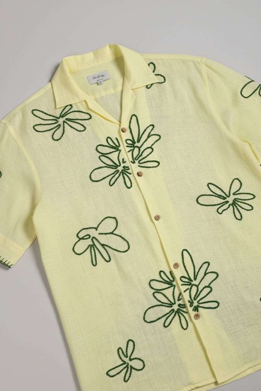 The shirt is detailed with green floral line embroidery on both front and back. These abstract botanical motifs create a stylish, artistic vibe perfect for summer fashion.