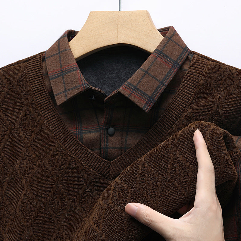 Sophisticated Dual-Layer Design: A masterful fusion of tradition and comfort, the Vintage Lattice Knit Ensemble combines a diamond-patterned knit overlay with a classic plaid shirt base for a refined, layered look.